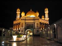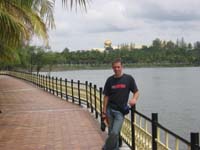 Nach einem Mittagessen am Flussufer hat Thomas auf dem Weg zum Busbahnhof zum dritten Mal den Film "Das Boot" gekauft (die ersten zwei waren kaputt). Vom Busbahnhof sind wir bis zu einer Haltestelle in die Nähe des Sultanpalastes gefahren. Leider ist das größte Wohnhaus der Welt in dem der reichste Mann der Welt (Sultan von Brunei) wohnt von einem großen bewaldeten Park umgeben, so dass man kaum etwas sieht. Als wir gerade am bewachten Einganstor vorbeigegangen sind, öffnete sich dieses plötzlich. Diese Chance nutzte Thomas und blieb vor dem Tor stehen, um ein Foto zu schießen. Der Wachmann signalisierte uns, dass wir sofort den Eingangsbereich frei machen sollen. Dies war gerechtfertigt, denn Sekunden später kamen drei Limousinen mit Polizeieskorte und weiteren Begleitfahrzeugen um die Ecke geschossen. Wir vermuten, dass darin der Sultan saß. Nach diesem Erlebnis haben wir eine Bushaltestelle gesucht, um wieder zurück in die Stadt zu fahren. Am Abend besichtigten wir einen Vergnügungspark, der sich ca. 30 min außerhalb der Stadt befand. Dieser sehr gepflegte Park hatte super Fahrgeschäfte, allerdings war er komplett leer. Insgesamt waren vielleicht 10 Besucher anwesend. Zurück gefahren wurden wir von einem Privattaxi, dass uns noch zur der größten und teuersten Moschee des Landes brachte. Zurück in der Stadt haben wir unser letztes Geld beim KFC in Essen investiert.