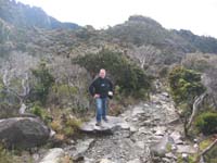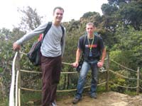 Der Aufstieg zur Mittelstation: Der Mount Kinabalu wird in zwei Etappen "bezwungen". Um 8:30 Uhr sind Thomas und ich zusammen mit zwei Schweden, einem Kanadier und einem Guide auf 1800m Höhe losmarschiert. Unser Etappenziel war die Mittelstation auf 3300m Höhe. Man steigt auf unregelmäßigen Treppenstufen ständig bergauf durch den Bergwald. In einer Höhe von 2100m erreicht man den tropischen Nebelwald. Die Bäume werden kleiner und sind häufig mit Moosen bedeckt. Im Unterholz wachsen über 20cm hohe Kannenpflanzen. Die Landschaft ist wirklich super. Thomas und ich haben uns nach 2km von der Gruppe abgesetzt, weil es uns zu kalt wurde, als die anderen Pause machten. Nach 6,5km und nur 3 Std. erreichten wir ziemlich erschöpft unsere Unterkunft auf der Mittelstation. Nach einer warmen Dusche und einer Suppe erholten wir uns wieder. Wir teilten unser Zimmer mit den anderen Drei aus der Gruppe. Der Rest vom Tag war Zeit absitzen im Haus, da es draußen regnete. Um 10 Uhr sind wir ins Bett.