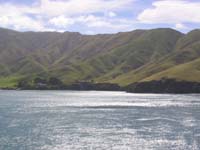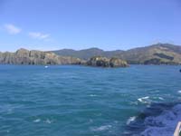 Überfahrt mit der Fähre von Wellington (Nordinsel) nach Picton (Südinsel). Um 9.30 Uhr legte die Passagier-und Autofähre ab und erreichte nach 3-stündiger Fahrt Picton. Die letzte Stunde der Fahrt ist die landschaftlich am schönsten, denn das Schiff fährt durch "Malborough Sound". Das ist eine lange Bucht, die von steilen Hängen begrenzt wird.