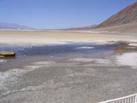 trockener. Es wächst gar nicht mehr. Im Sommer können die Temperaturen auf über 50°C im Schatten steigen. Heute waren es bestimmt 30°C. Die hügelige Landschaft, die das Tal umgibt bietet ein breites Farbspektrum. Dies ist durch Sedimente eines früheren Sees entstanden. Im Tal befindet sich sich die tiefste Stelle der USA (85m unter Meereshöhe). Dort ist ein kleiner Wassertümpel, der von von unterirdischen Quellen gespeist wird. Aufgrund der ausgewaschenen Salze im Wasser wird diese Stelle "Badwater" genannt. Gegenüber befindet sich der schneebedeckte 3368m hohe "Telescope Peak". Lebendig habe ich das "Death Valley" über den 1500m hohen "Towne Pass" wieder verlassen. Danach folgte eine 100km lange Fahrt durchs Nichts (keine einzige Ortschaft).